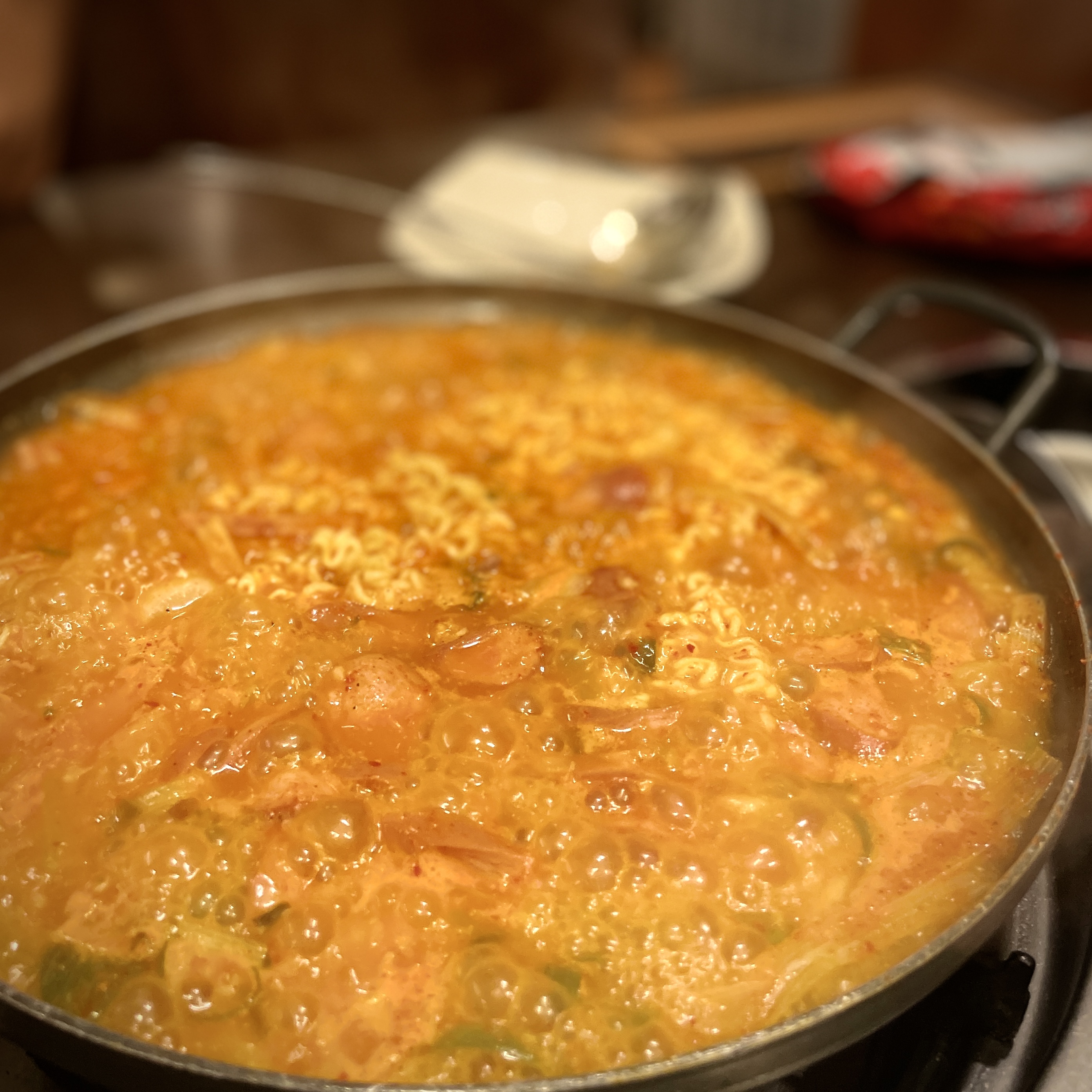 이렇게 나온다. 부대찌개는 보통 끓이다 보면 육수 한 번 더 리필해주고. 프랜차이즈 놀부 부대찌개나 여기나 뭐 별반 맛 차이는 모르겠다. 사실 부대찌개 맛집이라고 해서 별다른 거 없어. 맛 대부분 비슷. 내용물도 비슷. 근데 특이한 건 여긴 라면 사리를 신라면 주더라. 예전에는 안 그랬던 걸로 기억하는데.