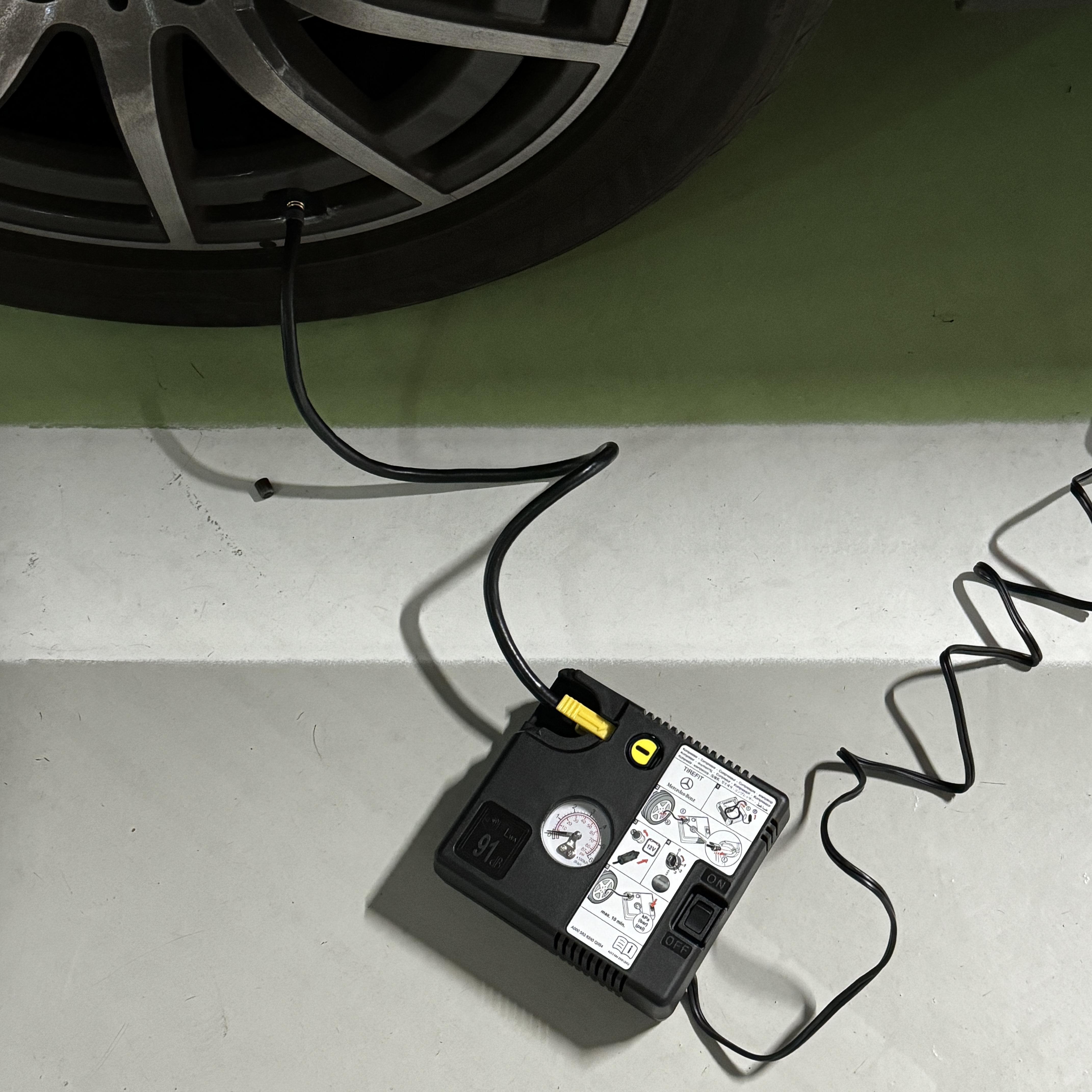 여튼 이렇게 타이어 공기압이 낮아지면, 인근 주유소 중에서 타이어 공기압 주입 기계가 있는 곳으로 가곤 했는데, 문득 차 트렁크에 기본적으로 제공하는 벤츠 타이어핏(TireFit) 키트가 떠올라서 주차장에서 한 번 이용해봤다.