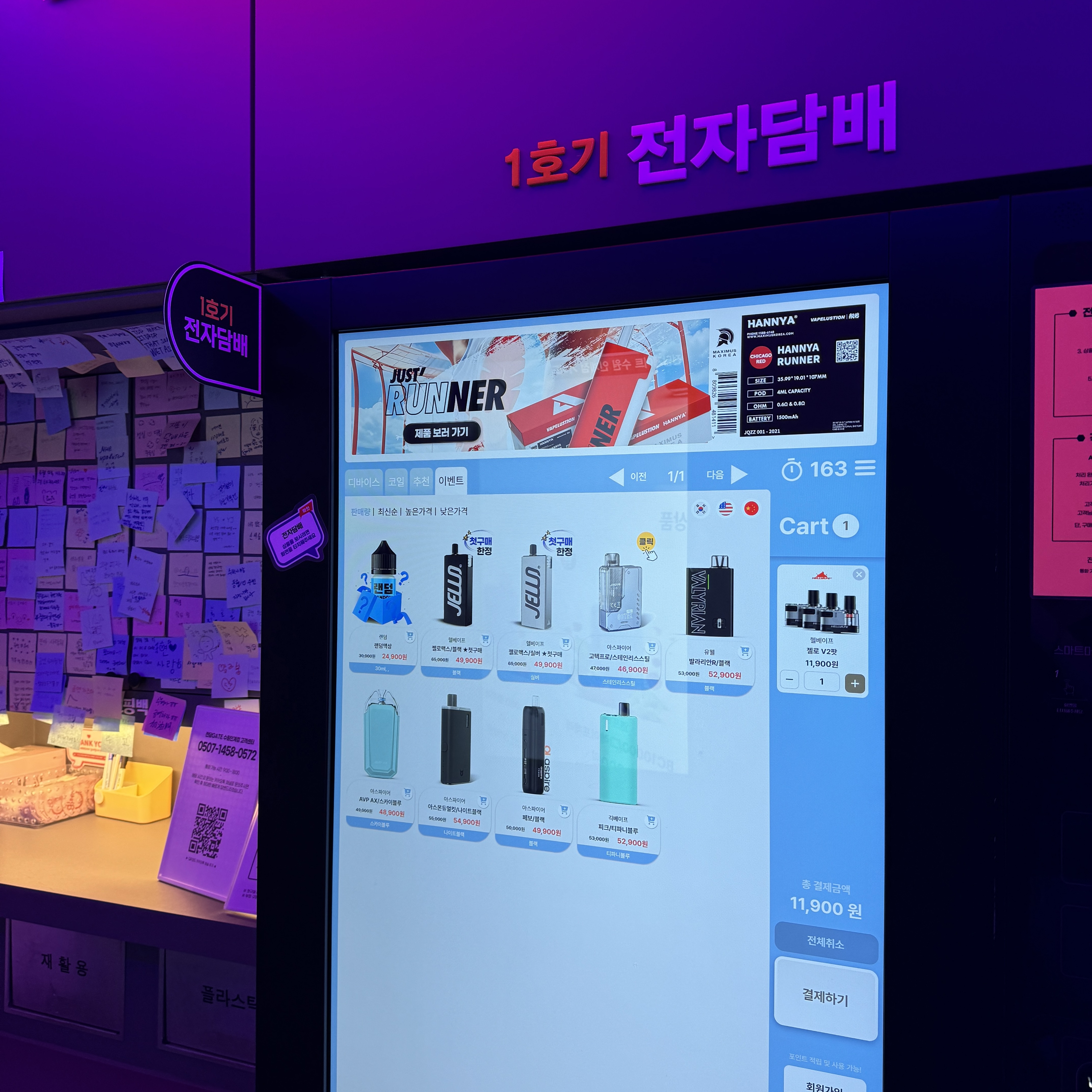 내부를 왜 이렇게 어둡게 해뒀는지 모르겠지만, 마치 성인용품 샵에 온 듯한 그런 느낌? 여기는 자판기 3대 있던데, 3대 모두 같은 걸 파는 건 아니니까 뭐 파는지 눌러보면서 내게 맞는 걸 찾아야 되더라. 전자담배 기기도 팔고, 카트리지도 팔고, 액상도 판다. 다 판다고 보면 된다. 카트리지라고 하나만 있는 건 아니고 종류가 있는데, 내가 쓰는 건 젤로 V2 부스트 팟. 이게 좀 더 출력이 쎄고, 단맛이 강하게 난다. 3개 들이 한 세트 11,900원. 가격은 뭐 인터넷으로 사나 거의 비슷.