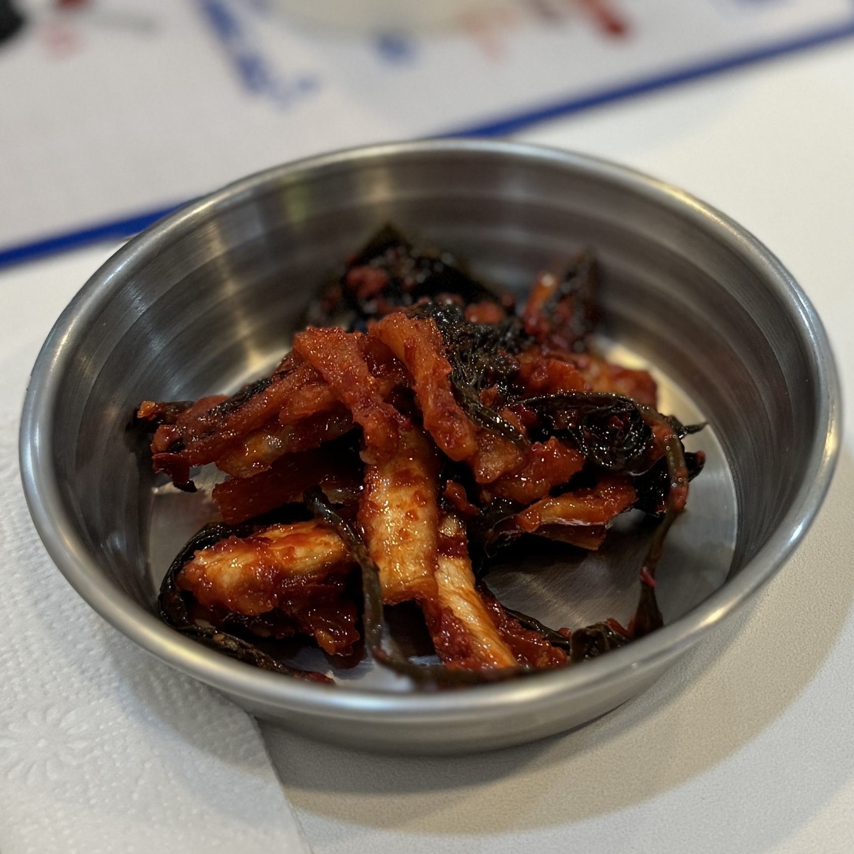 여기 많이 가면서 이것 저것 다양하게 먹어봤는데, 다른 메뉴들은 쏘쏘. 김치찌개의 경우도 내 입맛과는 조금 다른. 근데 왜 자주 갔냐? 일단 사장 동생이랑 친해졌고, 내가 보통 8시 30분 정도 되어서 퇴근했는데(당시에는 늦게 퇴근했다.) 그 시간에는 대부분 밥집 주문이 안 됐었거든. 그러다 보니 자주 가게 됐지. 반찬은 무말랭이랑 하나 더 있었는데. 두어 가지 나온다. 퓨전 한식이라 양이 많지도 않고, 가성비는 그렇게 뛰어나다고 할 순 없지만 간장버터밥은 맛있어.