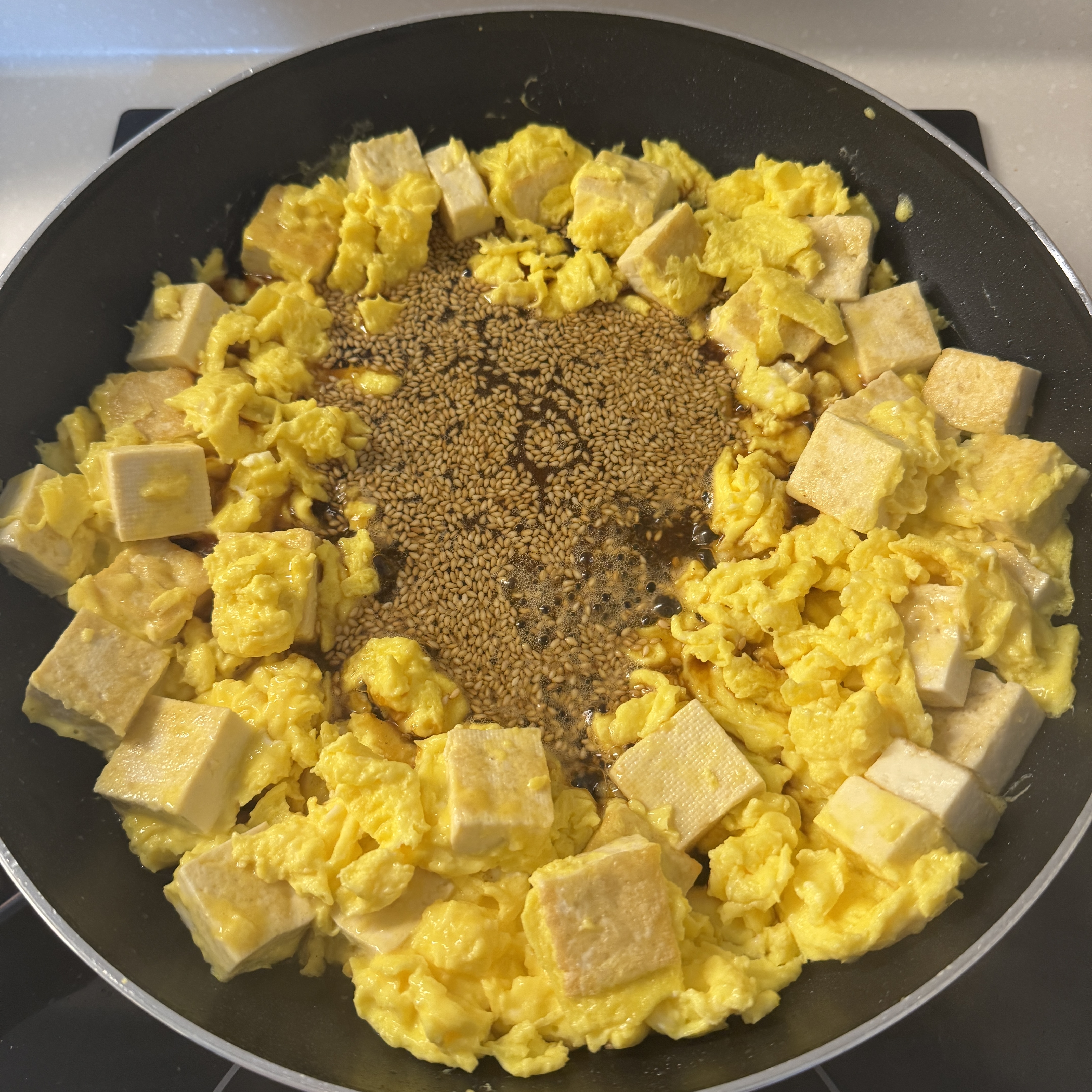 어느 정도 두부가 부쳐지면 계란물을 붓는다. 그리고 양념을 붓고. 양념이 끓어오르면