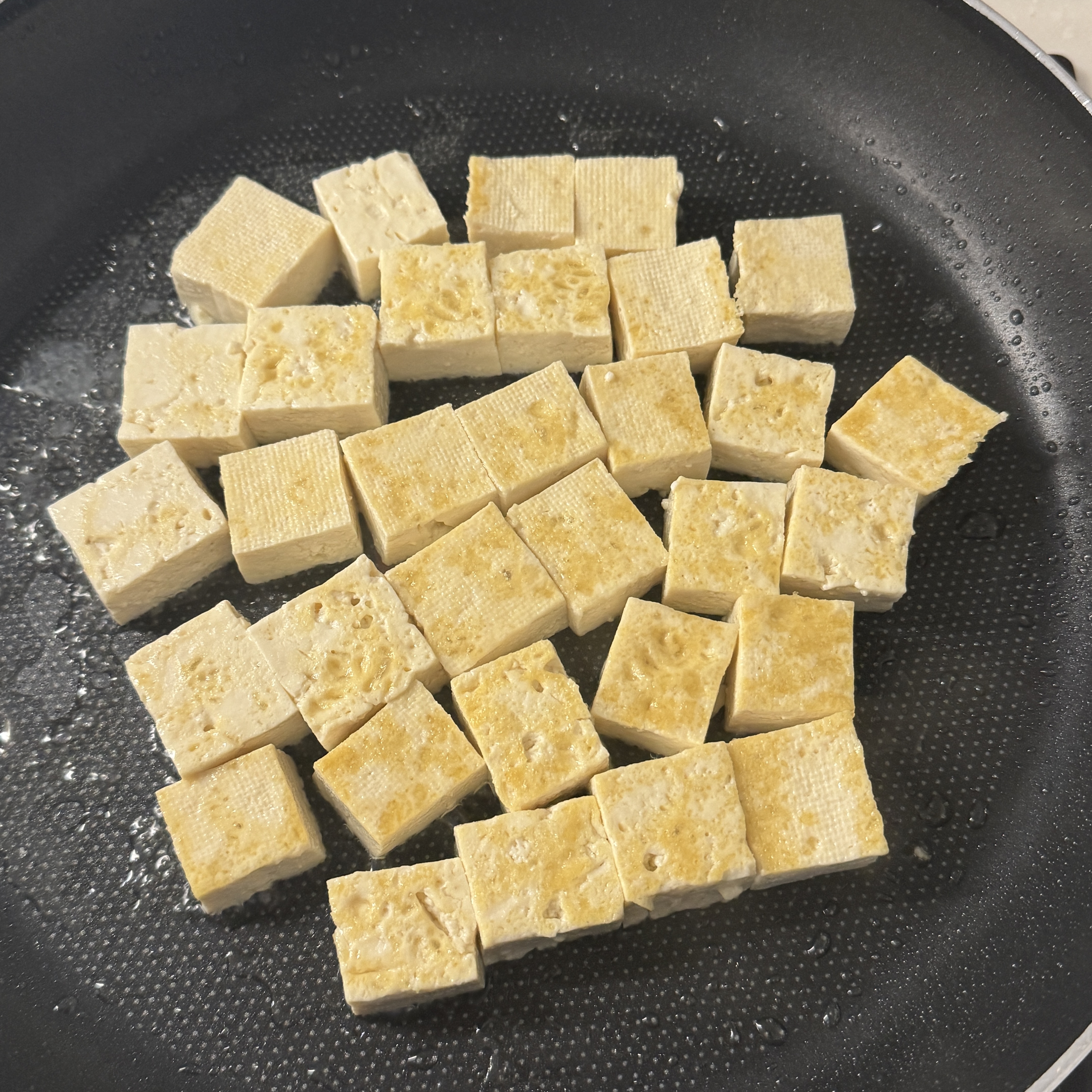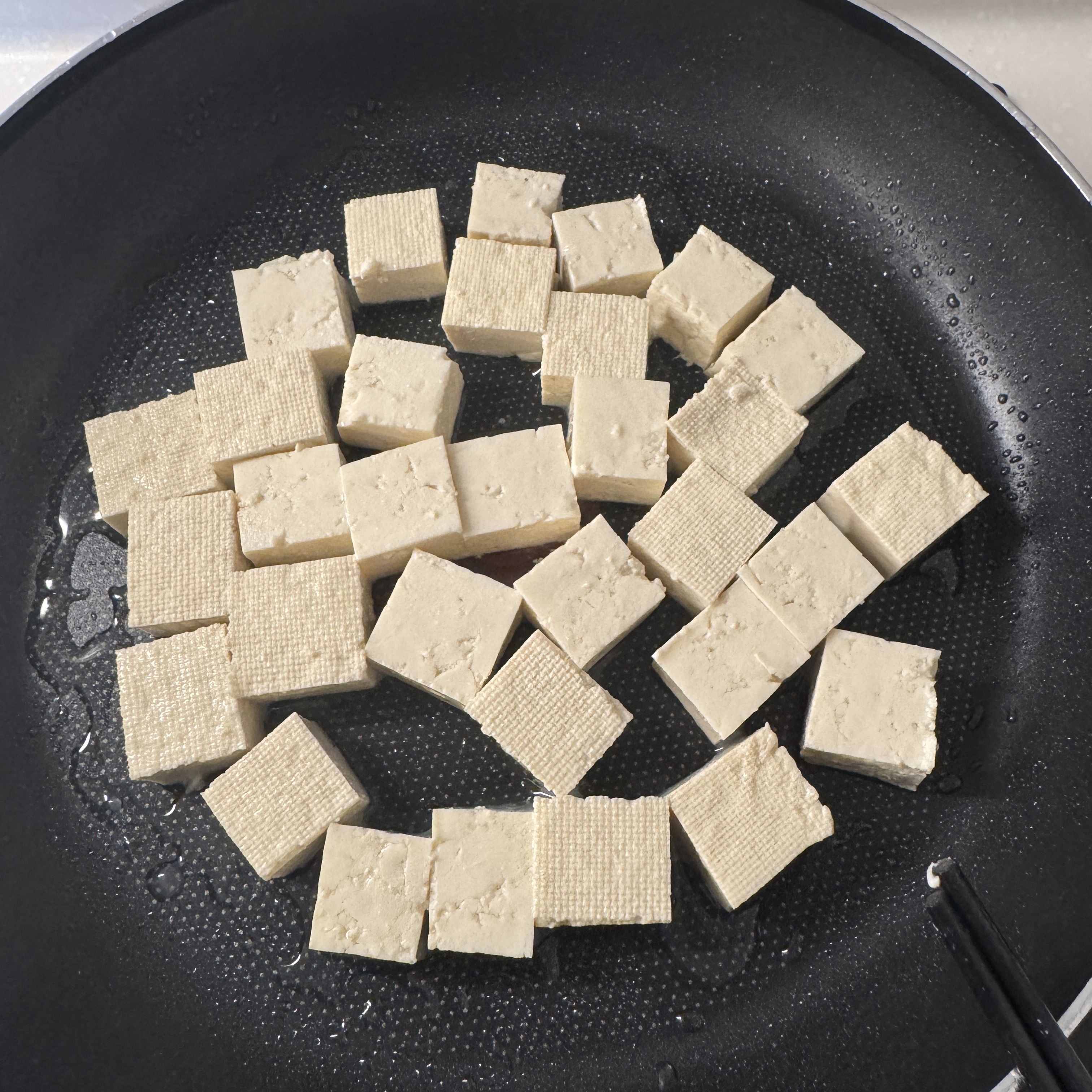 후라이팬에 잘라둔 두부 올려서 부쳐준다. 각 면을 다 노릇하게 부치라고 하는데 그냥 대충 부치면 된다.
