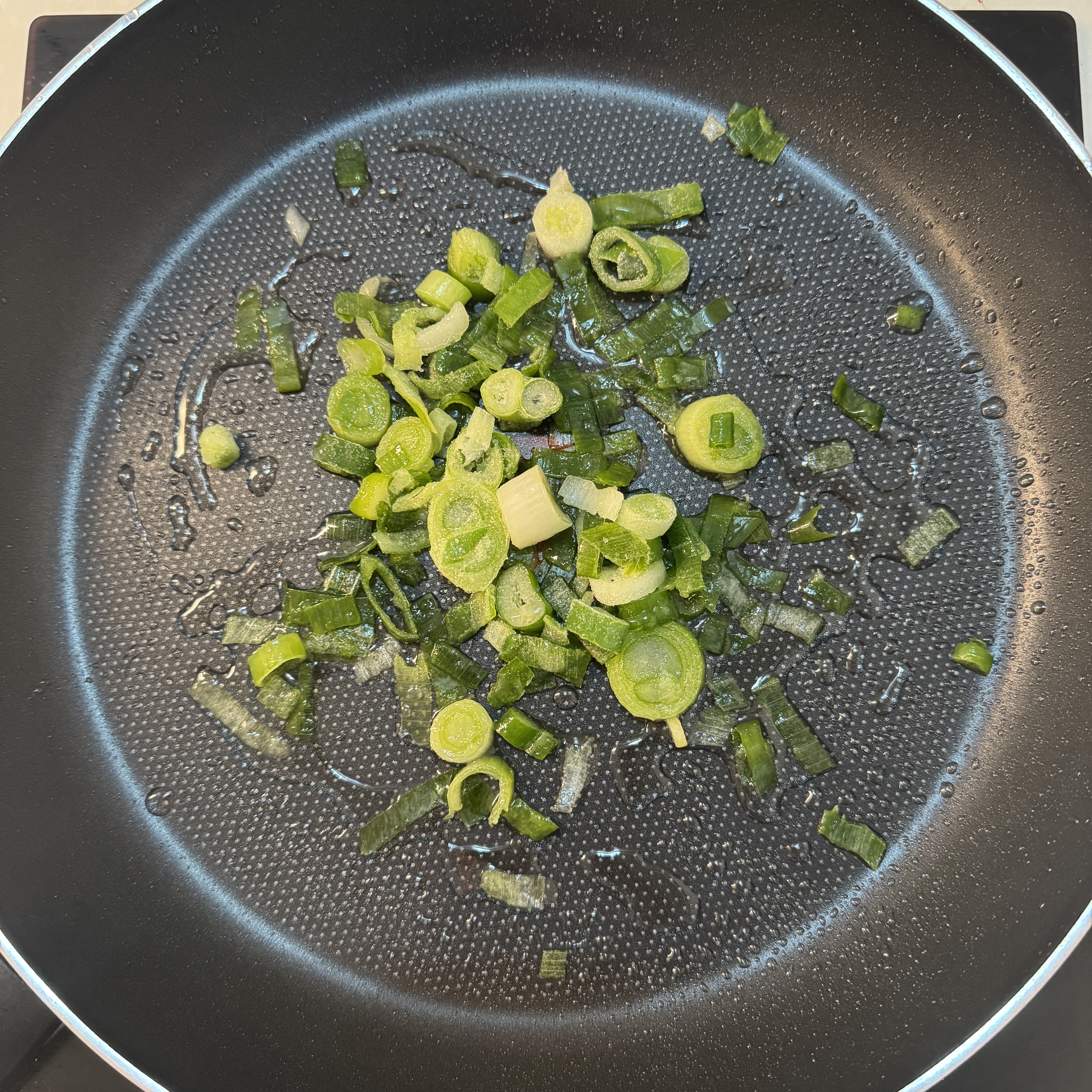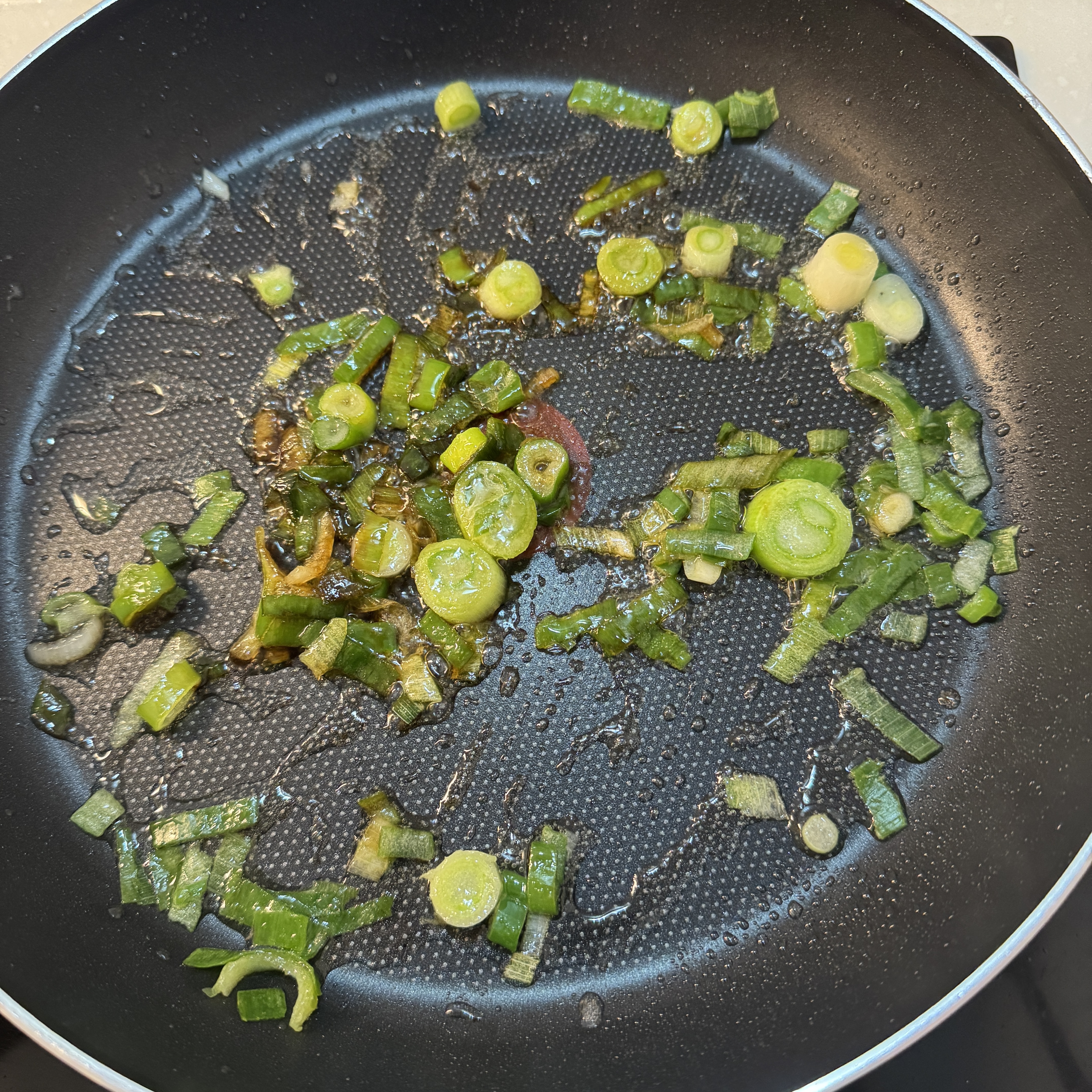 일단 냉동 대파 한 웅큼 집어서 팬에 올려주고 볶았다. 내 음식해본 지 얼마 안 되지만, 양념 만드는 거는 아낄 필요가 없다는 생각이다만, 그렇다고 너무 과할 필욘 없으니 적당히.