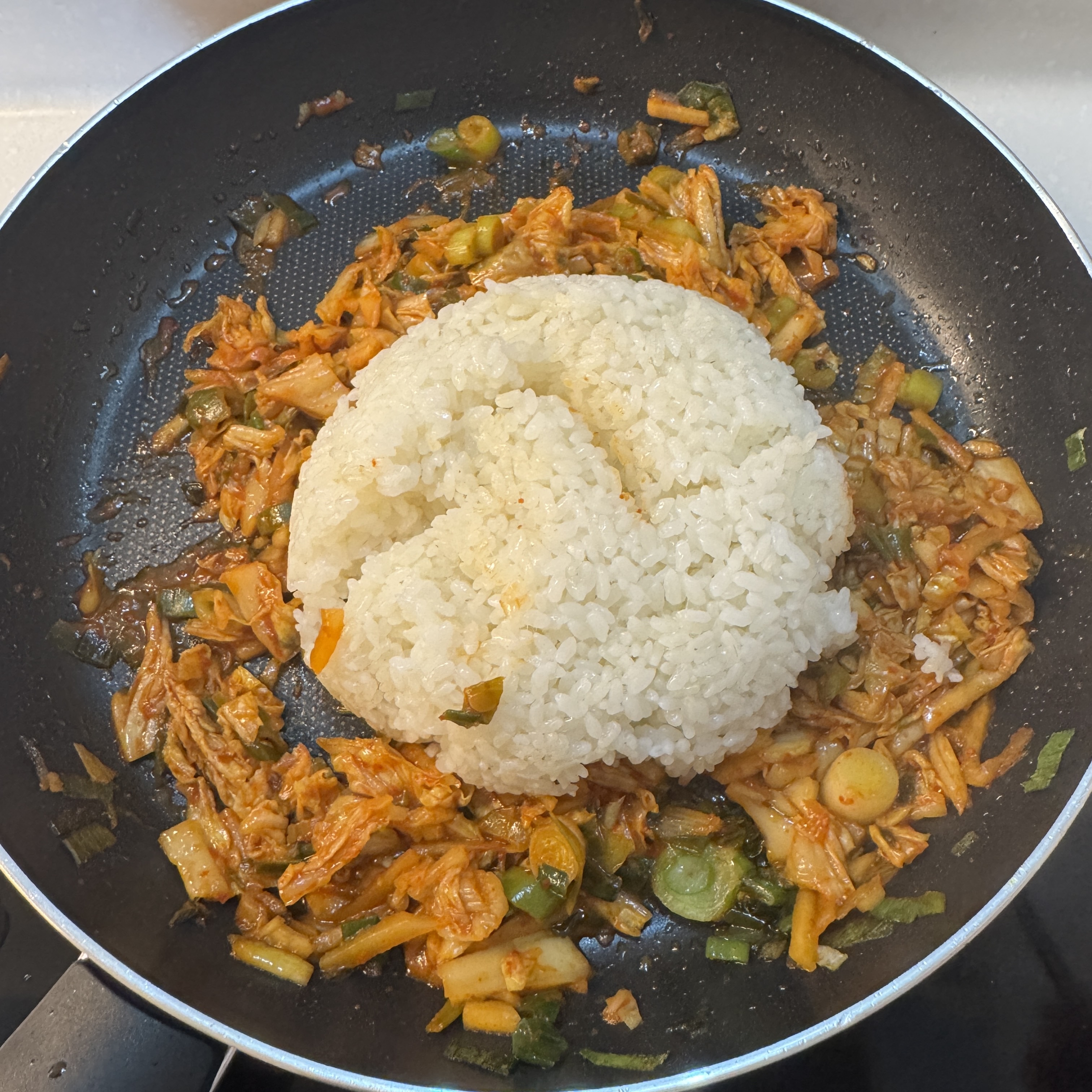 그리고 김치 넣고 볶고. 확실히 양념을 넣고 볶다 보면 군침이 돌아. 맛있는 냄새가 싹 올라오거든.