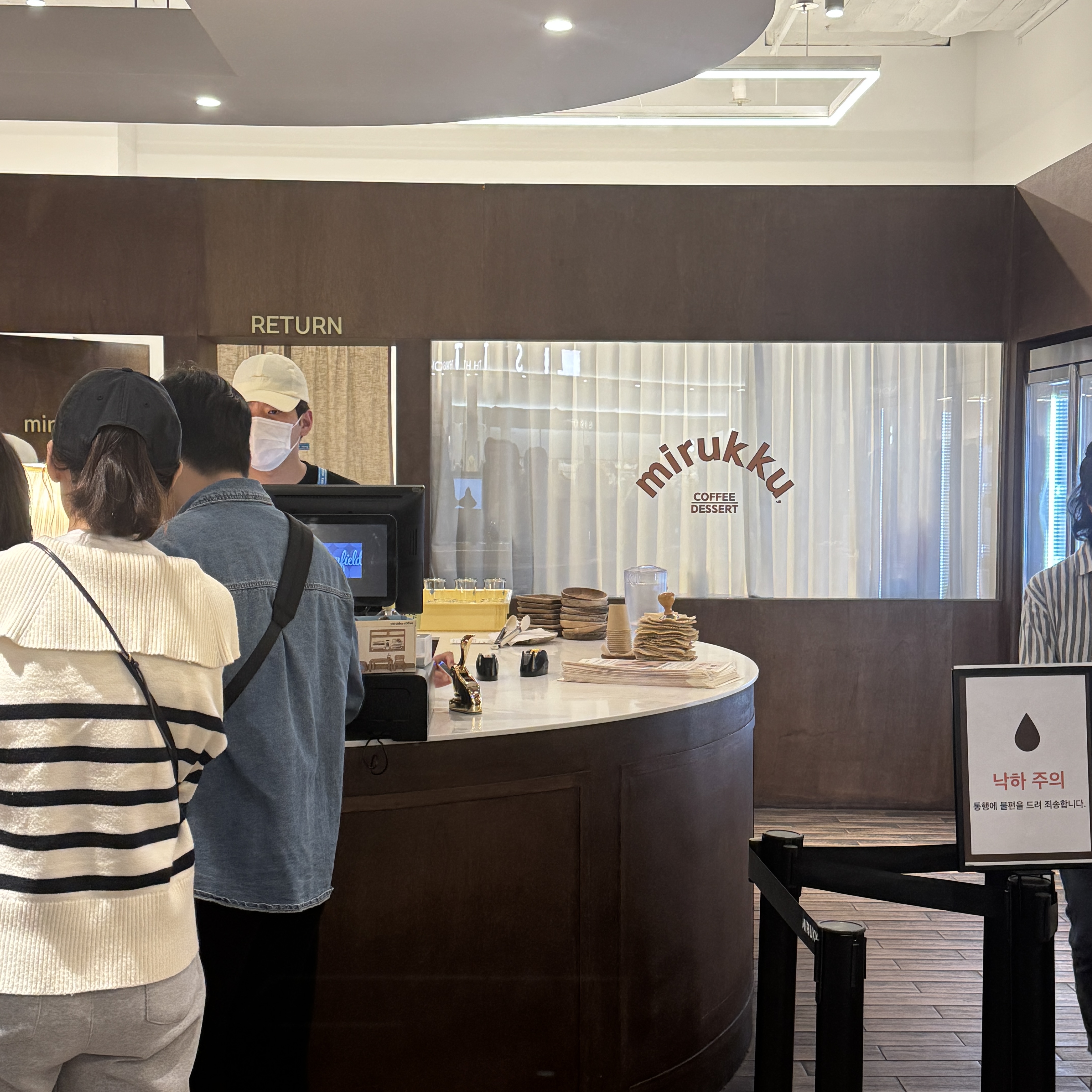 카운터 옆에는 티와 커피도 팔더라. 이거 사가는 사람도 있을라나 싶은데, 미루꾸 커피 로고가 스팀 피처(우유 데울 때 사용하는 기구)다. 게다가 블루 보틀 따라한 색상이 눈에 띈다. 판매하는 커피 포장지에는 다양한 색으로 되어 있긴 하지만.