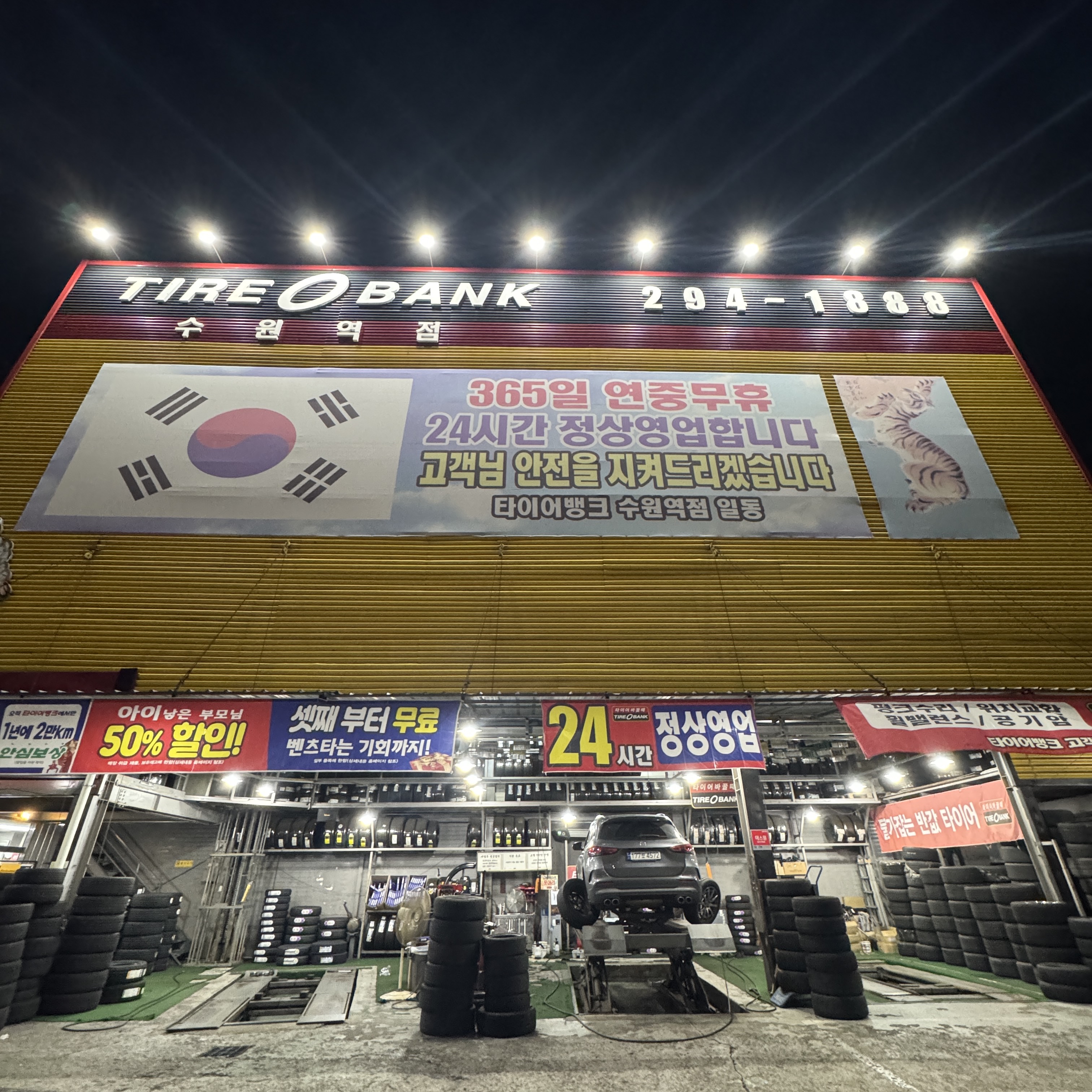 24시간 영업하더라. 하루에 몇 개의 타이어를 갈까?